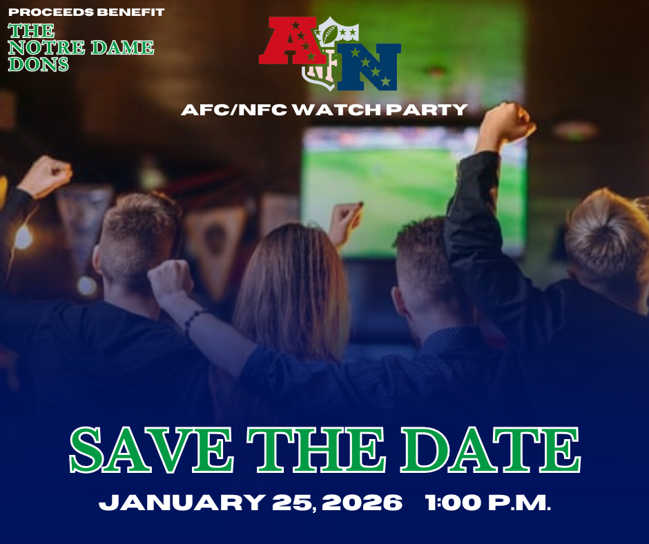 All proceeds benefit the Notre Dame College Prep Athletic Club! Come out and enjoy the AFC and NFC Championship games on Sunday, Jan. 25, 2026, from 1 p.m. to 9 p.m., in the NDCP cafeteria! Tickets for the viewing party are $60 or a table of 8 for $420 (tables must be purchased in advance). All food and beverages are included.